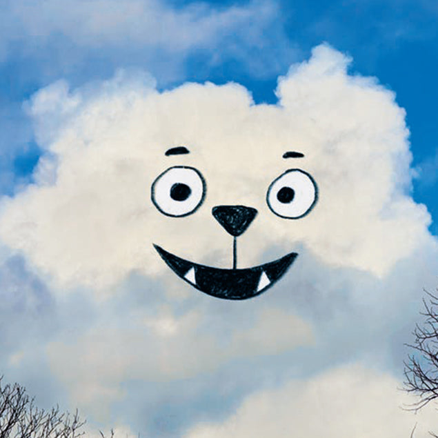 Card with a cloud shaped like a bear face against a blue sky with trees.